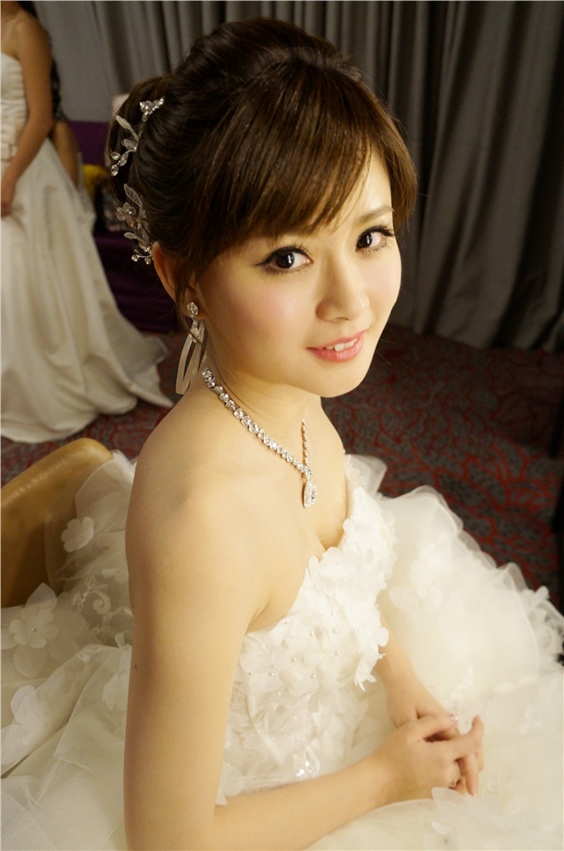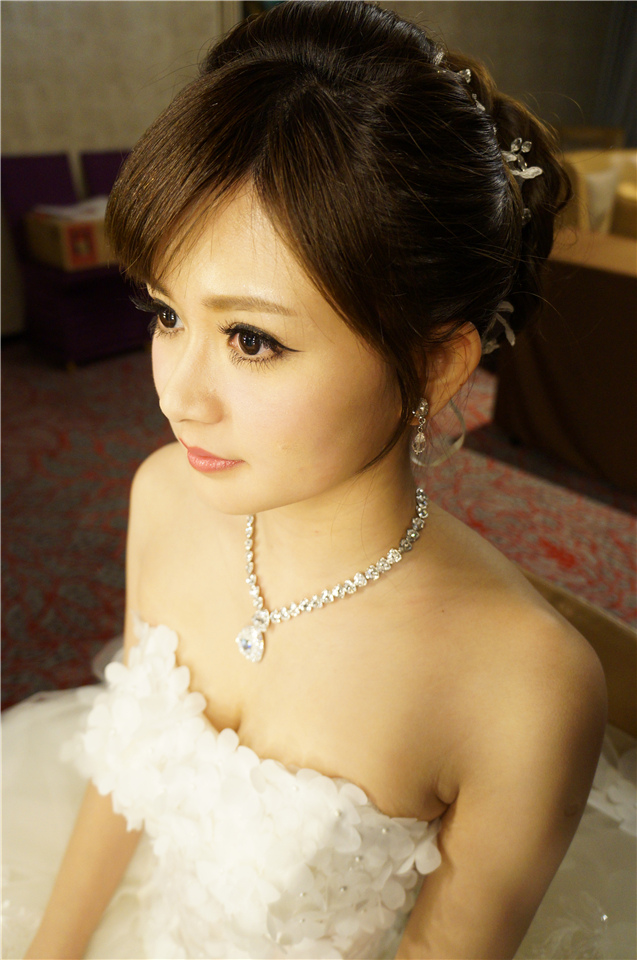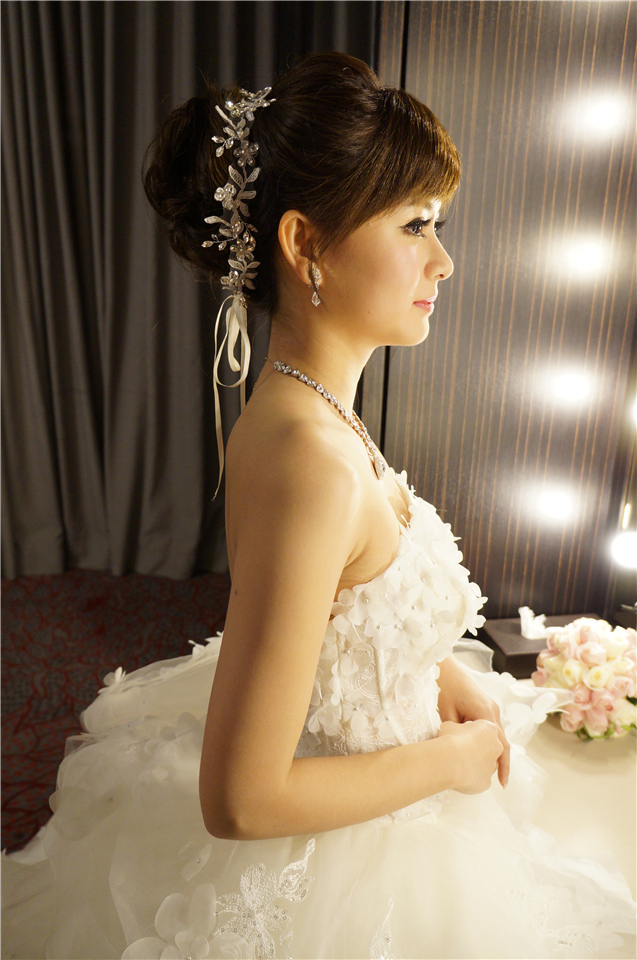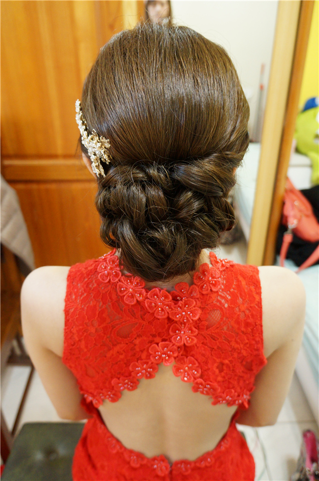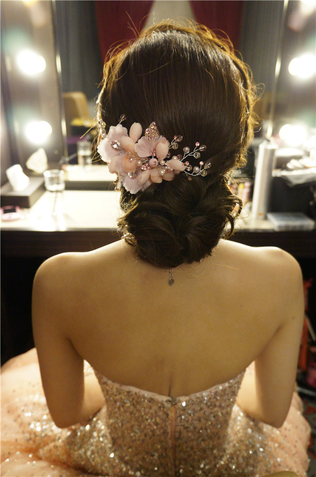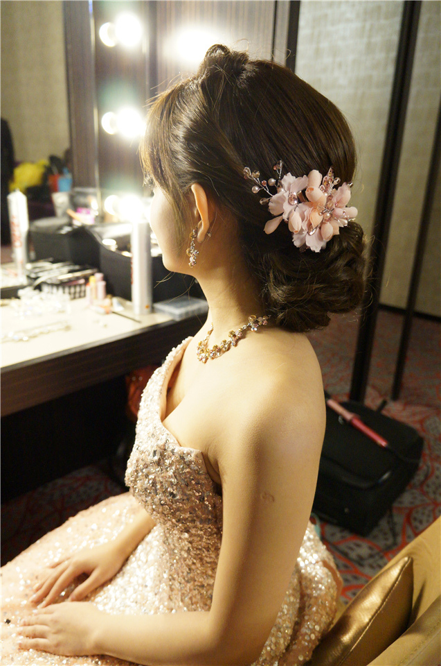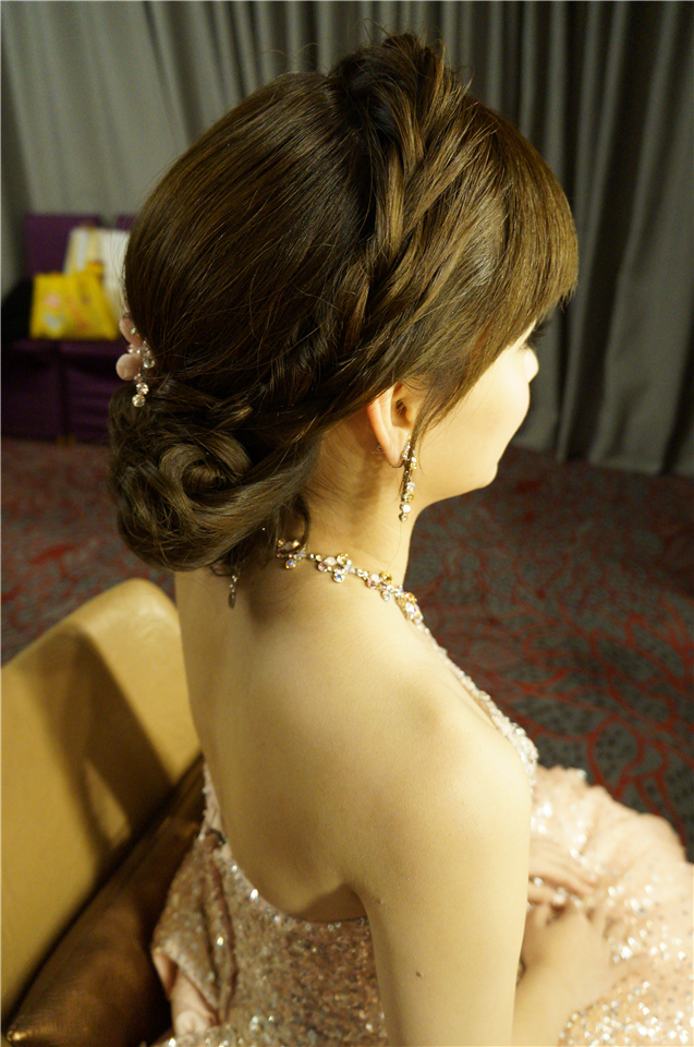 這個造型呢,是依照她當時給我的感覺,隨興抓出來的,我蠻常這樣的,因為在婚宴前沒見過新娘本人,只能看照片來揣摩造型,所以當見到新娘穿上禮服後又給了我靈感,改變造型是常有的事,這時候新娘的信任就很重要了,不然心臟不大顆就會蠻驚嚇的,但我可是對自己的美感很自信的呢