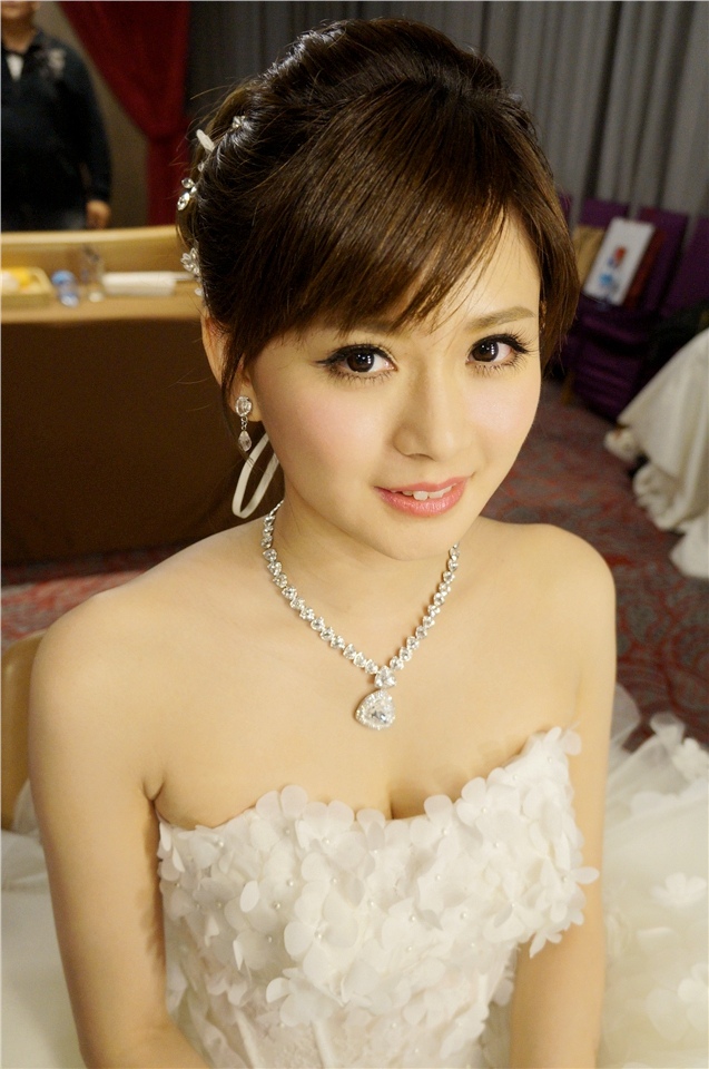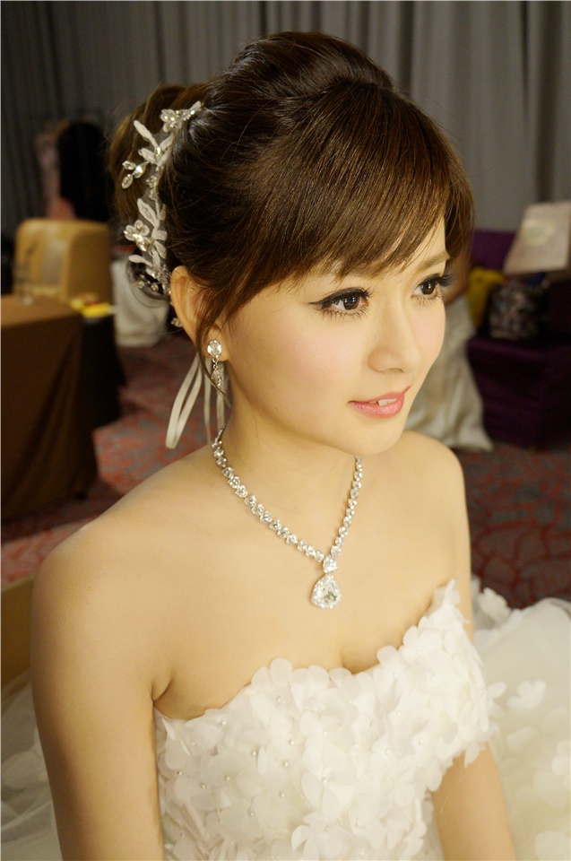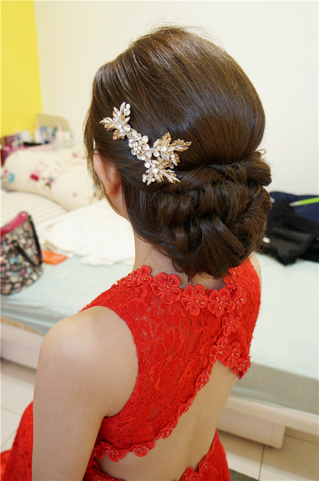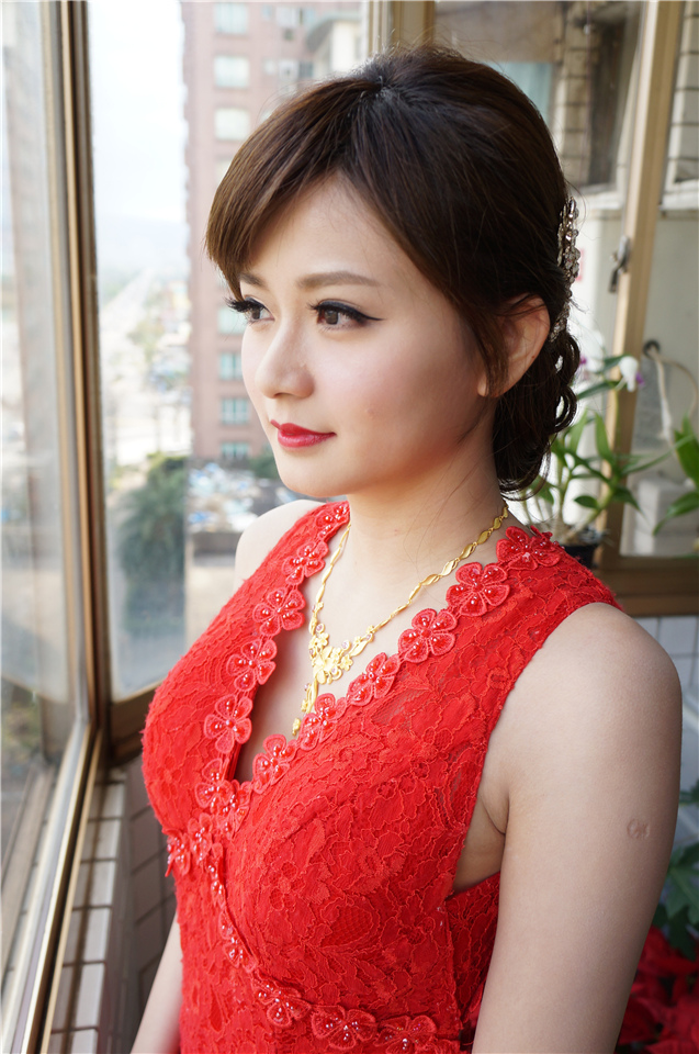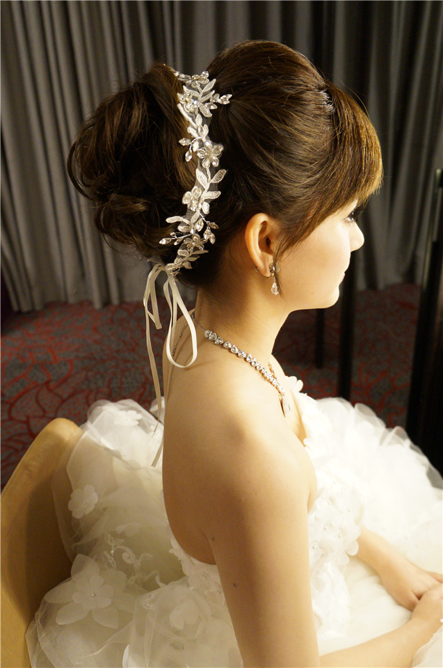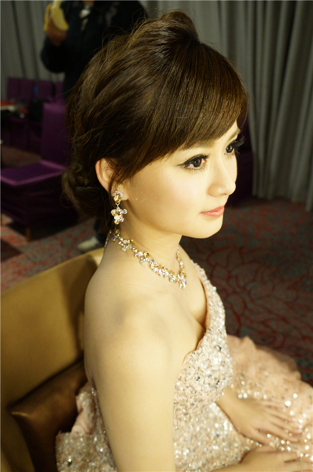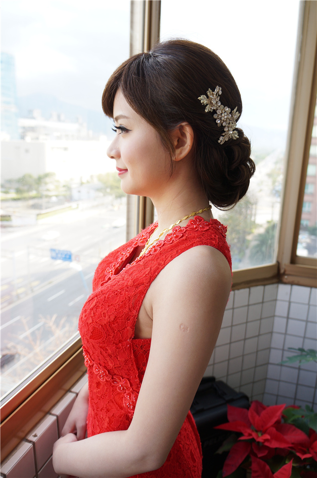 這個造型呢,是依照她當時給我的感覺,隨興抓出來的,我蠻常這樣的,因為在婚宴前沒見過新娘本人,只能看照片來揣摩造型,所以當見到新娘穿上禮服後又給了我靈感,改變造型是常有的事,這時候新娘的信任就很重要了,不然心臟不大顆就會蠻驚嚇的,但我可是對自己的美感很自信的呢