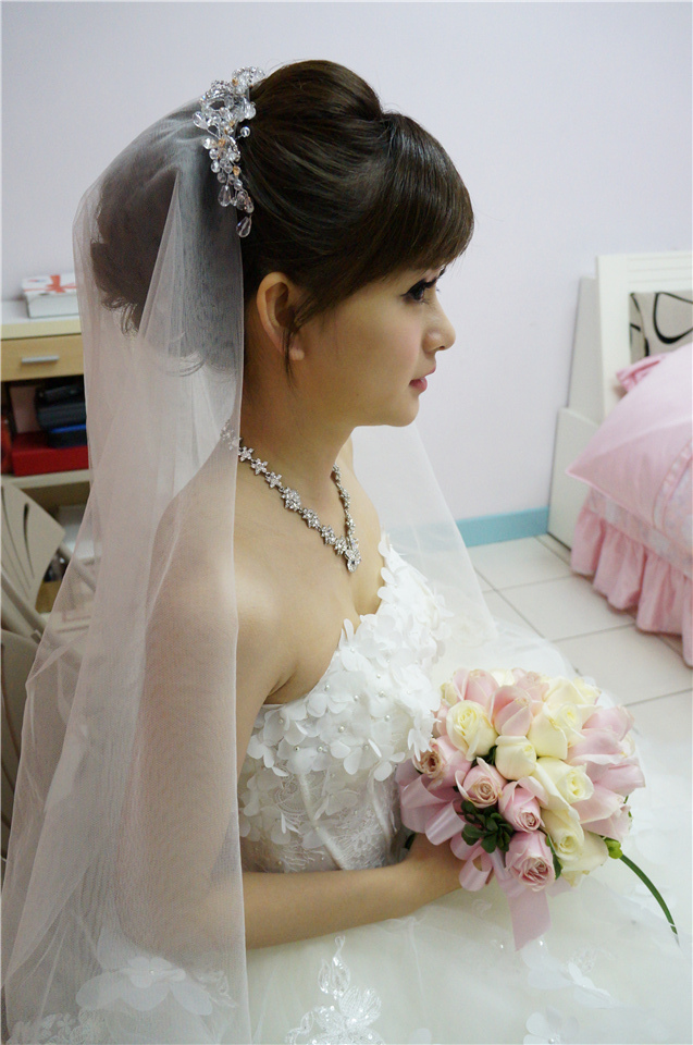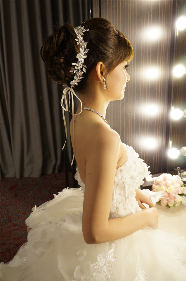 以手捲的方式重新盤髮,搭上鑽類蕾絲髮帶,跟迎娶時完全不同的感覺,還蠻適合進場的