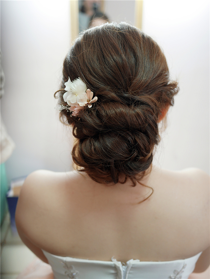 低盤髮就有婉約賢淑的感覺,利用盤繞拉絲,讓髮型浪漫自然