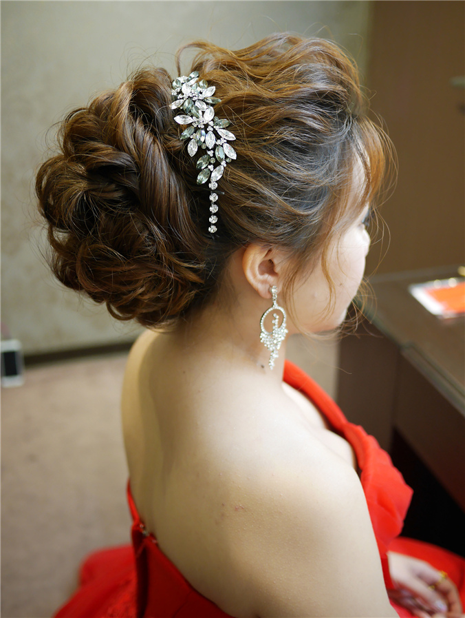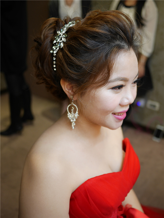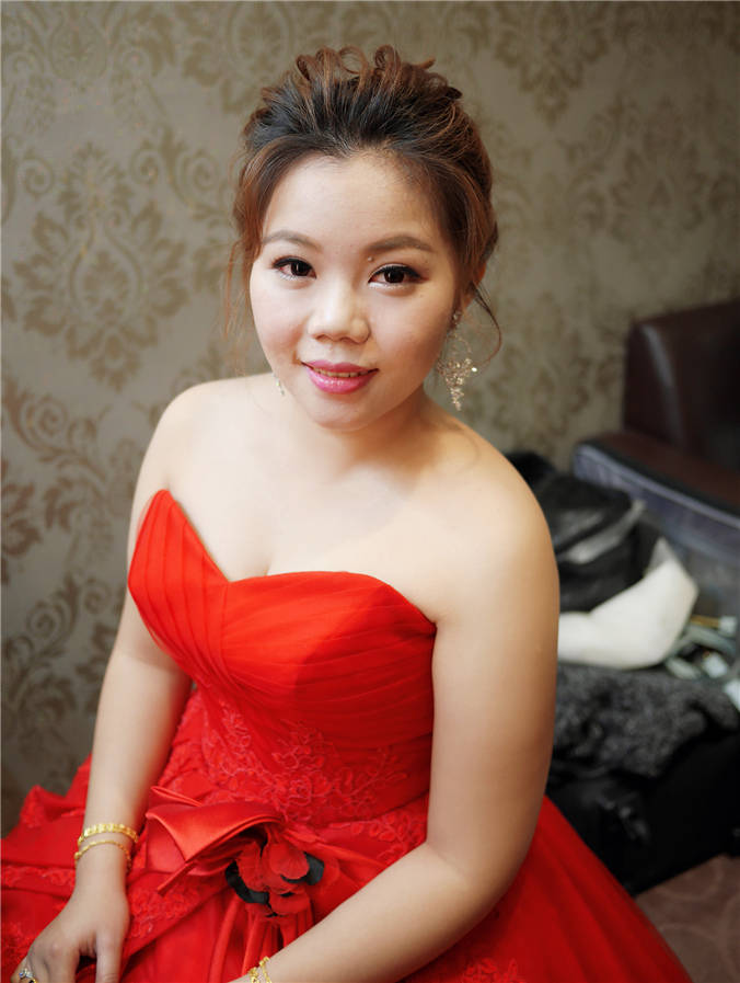 送客時換上大紅色的禮服,進場走紅地毯整個人明亮又貴氣,髮型可以來各高盤髮,盤繞的線條不會雜亂,反而有種細緻的規則