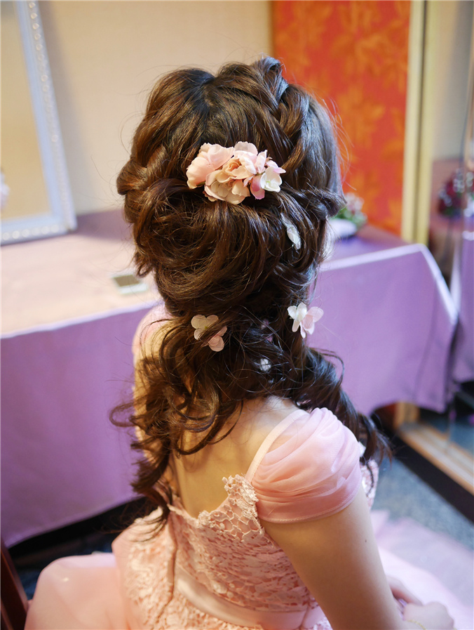 送客的粉紅色禮服讓琦琦變得好甜,幫她編髮再別上浪漫小花花