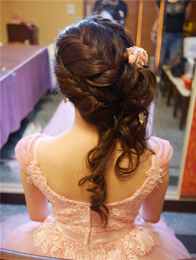 敬酒的造型是低馬尾,細心的上捲拉鬆再綁起來