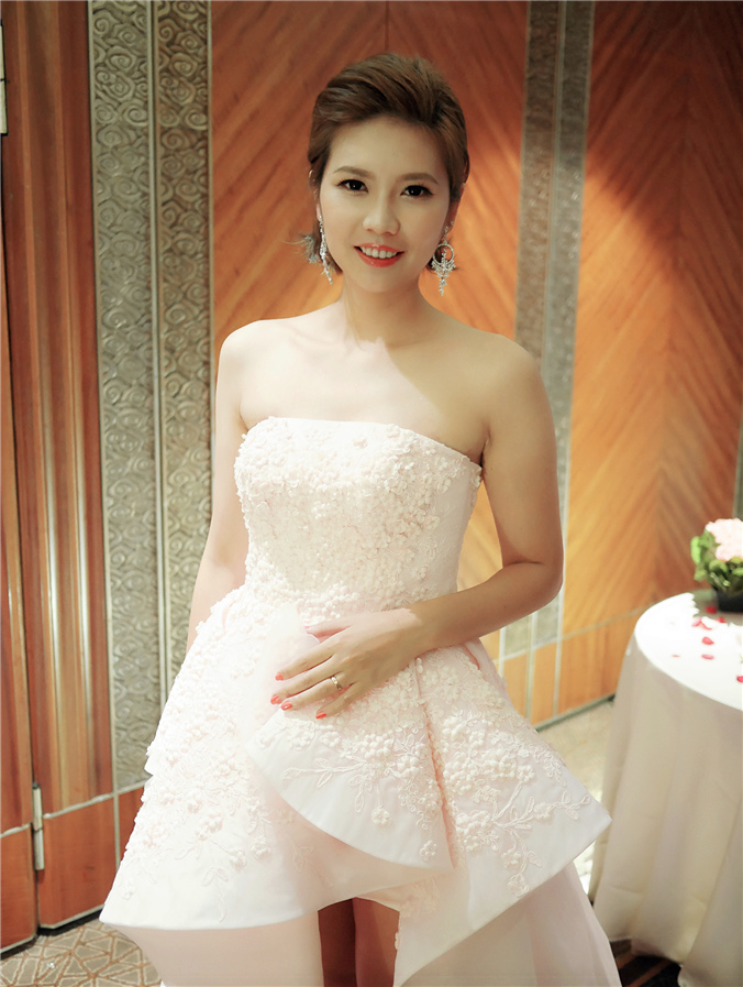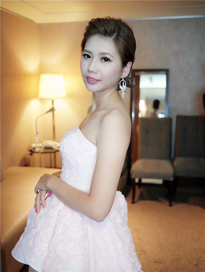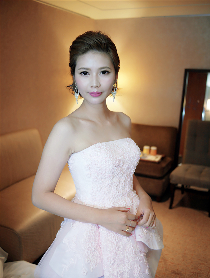 接著第二套嬰兒粉前短後長的禮服,其實這套看起來是走甜美風格的,但是安庭的臉是屬於比較有個性的,所以決定這套走時尚風格。